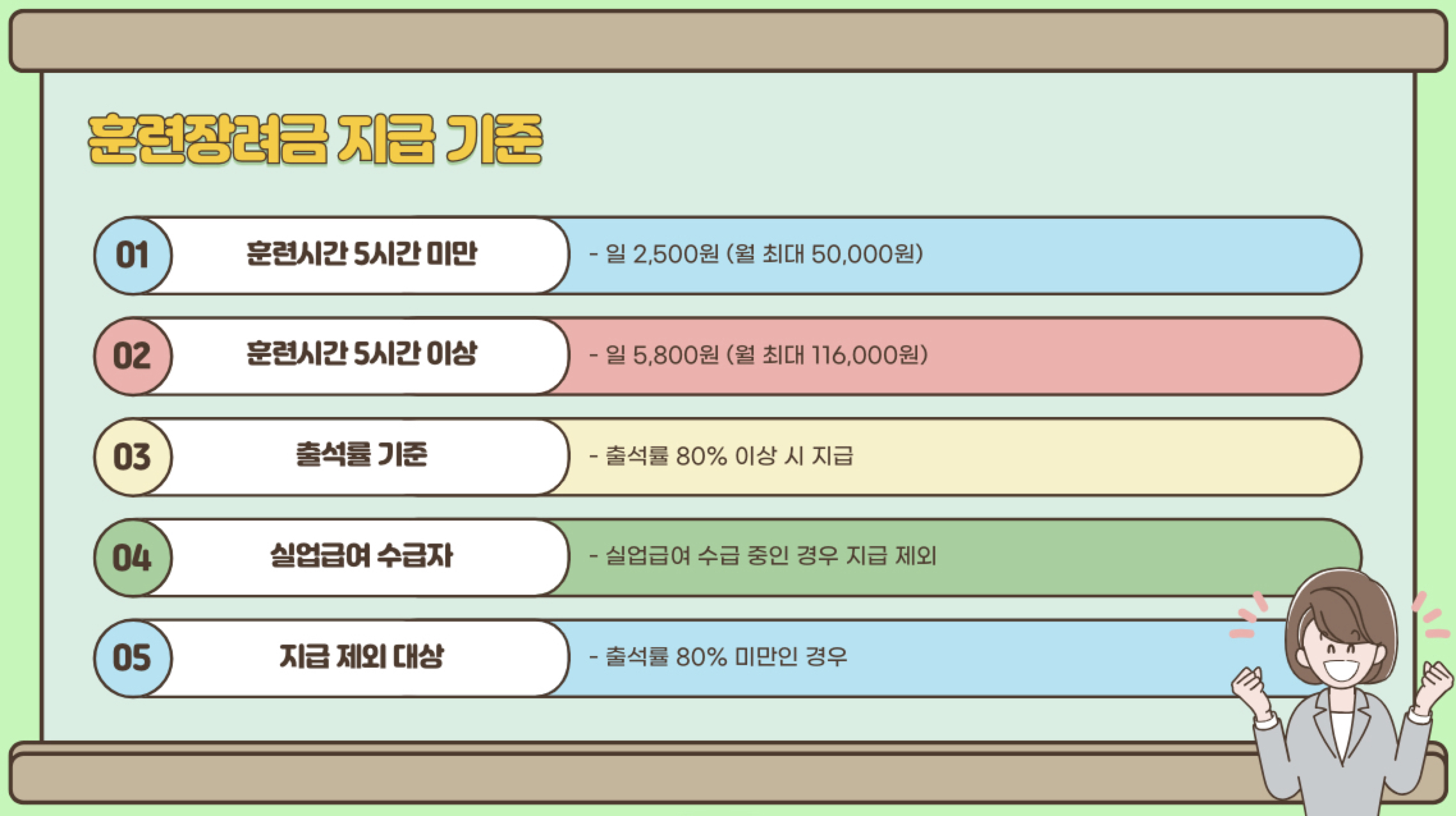 | 훈련장려금 | 출석률 80% 이상 | 월 최대 116,000원 |