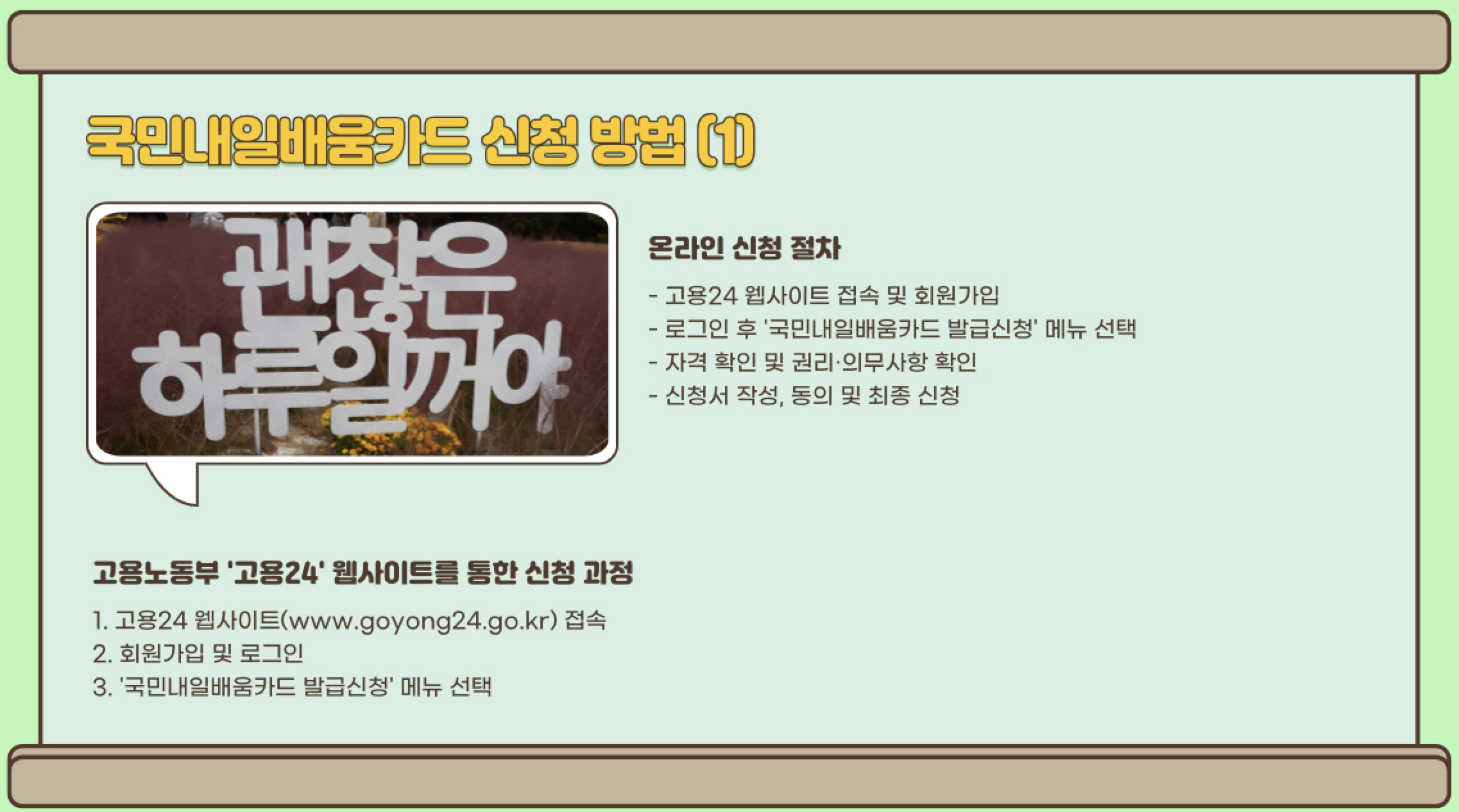 오프라인 신청을 원하시는 경우, 가까운 고용센터를 방문하여 신청할 수 있습니다. 이때 신분증과 필요한 증빙서류를 지참해야 하며, 고용센터에서 발급 확인서를 받은 후 지정된 은행에서 카드를 수령할 수 있습니다. 카드 수령 방법은 우편 배송 또는 직접 방문 중 선택할 수 있습니다.