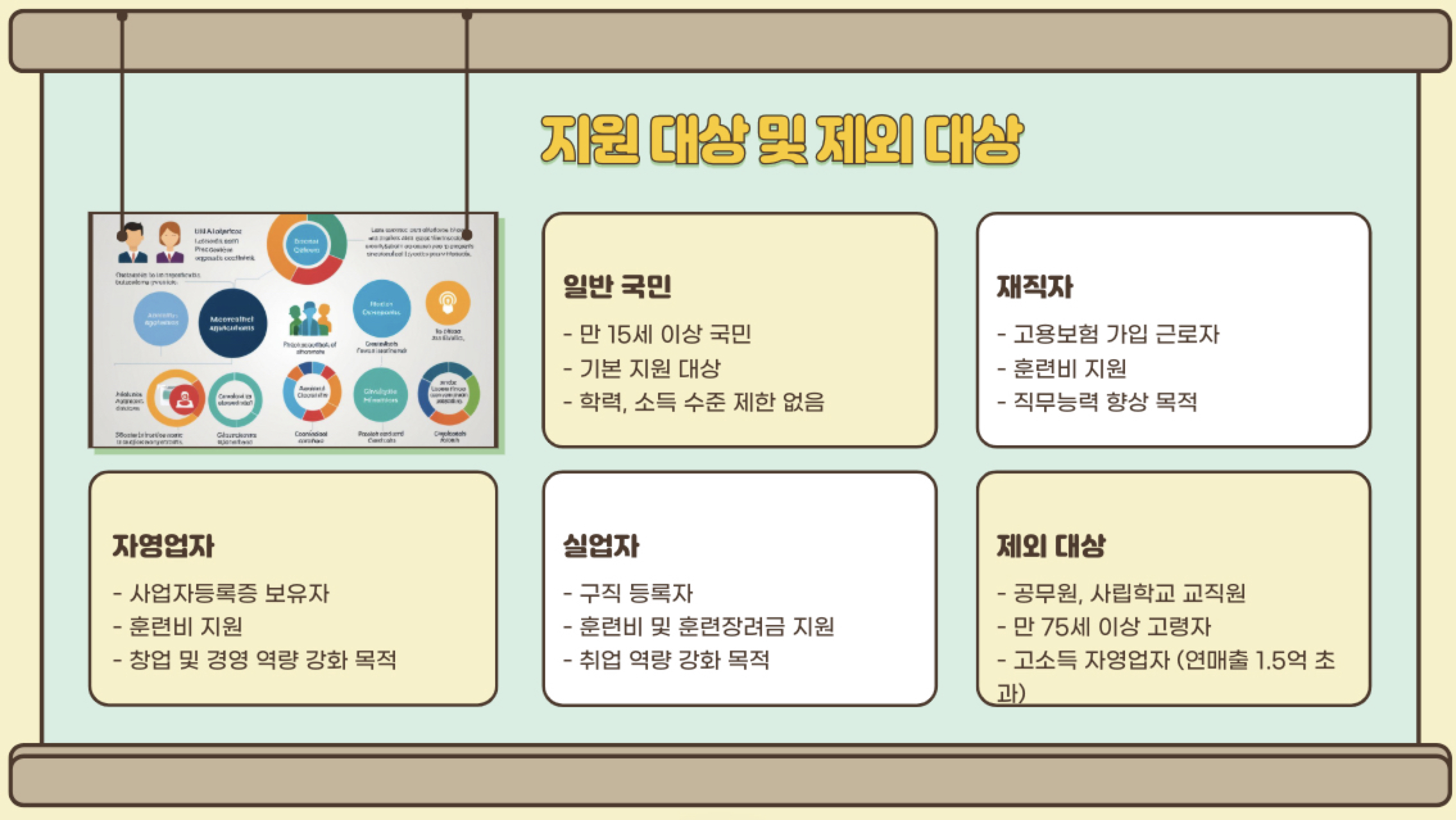 국민내일배움카드는 만 15세 이상의 국민이라면 누구나 신청할 수 있습니다. 실업자, 재직자, 자영업자 등 다양한 계층이 대상이며, 특히 직업훈련이 필요한 분들에게 적합합니다. 단, 일부 제외 대상이 있으므로 신청 전에 확인이 필요합니다.