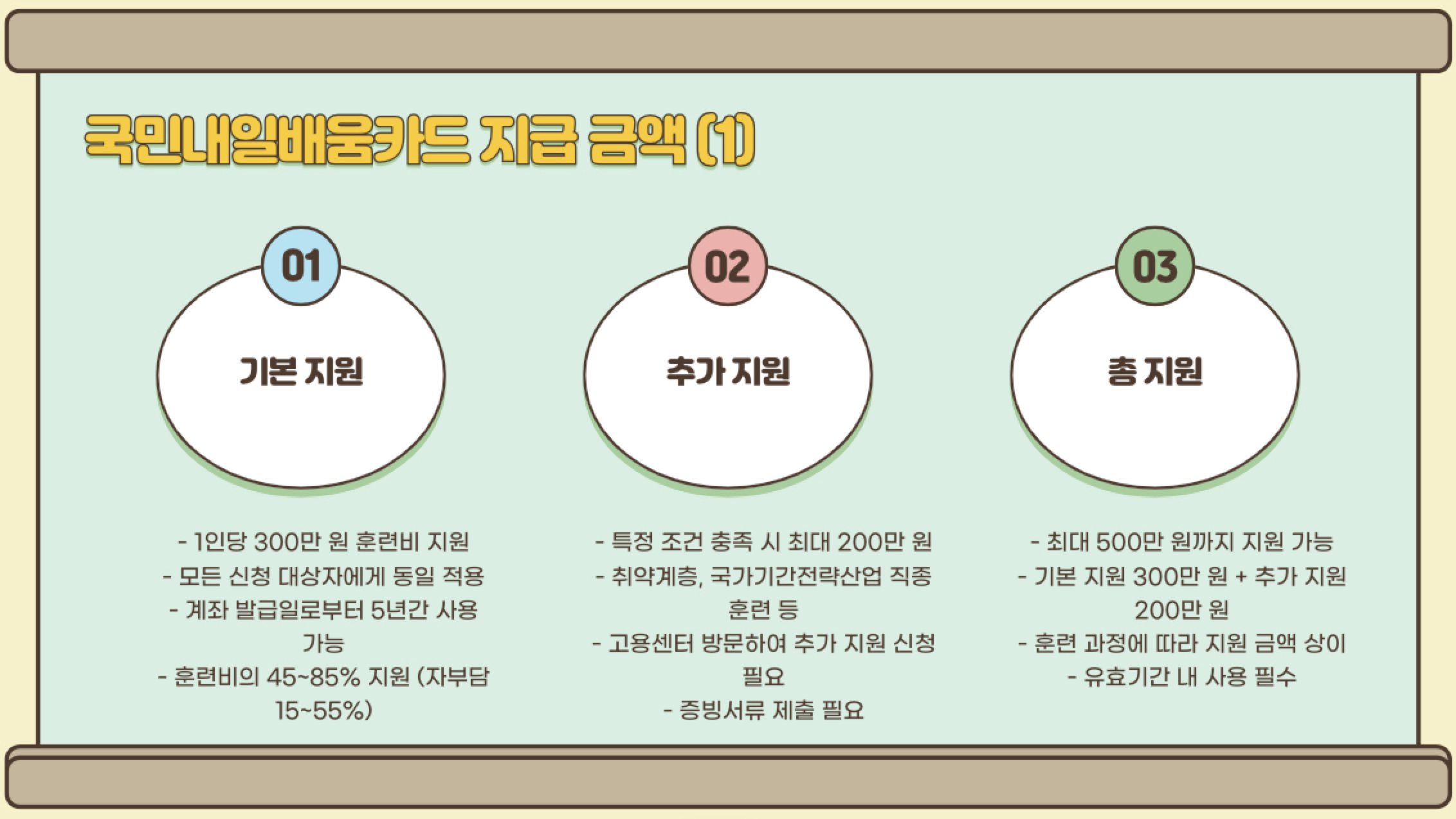 국민내일배움카드는 기본적으로 1인당 300만 원의 훈련비를 지원합니다. 추가로, 특정 조건을 충족하는 경우 최대 200만 원까지 추가 지원이 가능하여 총 500만 원까지 지원받을 수 있습니다. 추가 지원 대상에는 기간제·파견·단시간·일용근로자, 고용위기지역 및 특별고용지원업종 종사자, 출소예정자, 기초생활수급자 및 차상위계층, 장애인, 자립준비청년, 한부모가족 해당자, 북한이탈주민, 아프간 특별기여자, 가정밖 청소년 등이 포함됩니다. 추가 지원을 받기 위해서는 해당 자격을 증명할 수 있는 서류를 지참하여 고용센터를 방문해야 합니다.