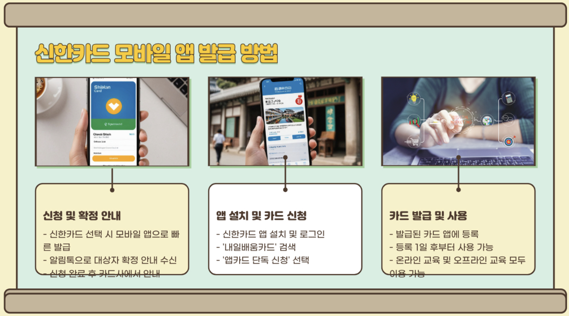 신한카드를 선택하면 모바일 앱을 통해 빠르게 카드를 발급받을 수 있습니다. 신청 완료 후 알림톡을 통해 대상자 확정 안내를 받게 되며, 신한카드 앱을 설치하고 로그인한 후 '내일배움카드'를 검색하여 '앱카드 단독 신청'을 선택하면 즉시 발급이 가능합니다. 발급된 카드는 앱에 등록한 후 1일 후부터 사용할 수 있습니다.