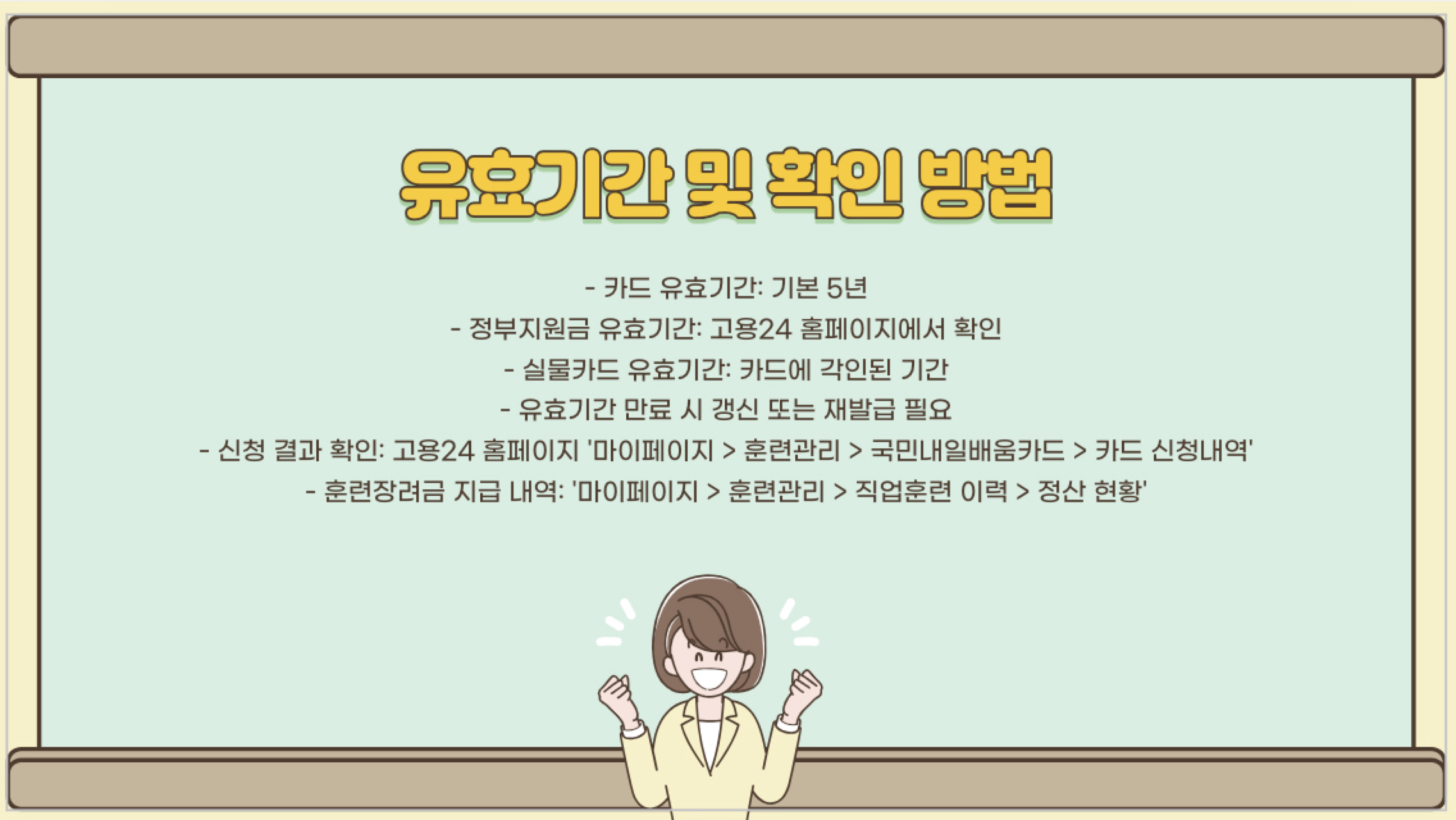 또한, 훈련과정의 시작일이 카드 유효기간 내에 있어야 지원이 가능하므로, 수강 신청 시 유효기간을 반드시 확인해야 합니다.